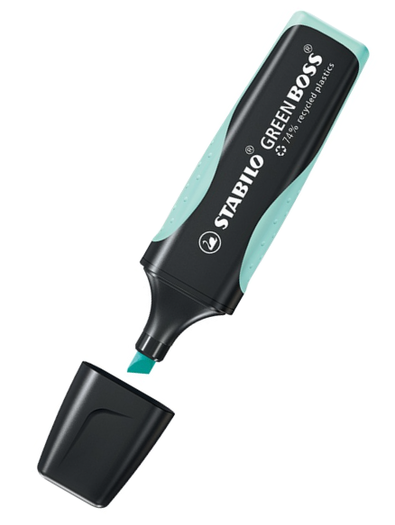 Der STABILO GREEN BOSS Pastel Textmarker besteht zu 74 % aus recyceltem Kunststoff und behält dabei die klassische Form, die gut in der Hand liegt. Die 2-Komponenten-Verarbeitung mit weicher Griffzone sorgt für angenehmen Halt.