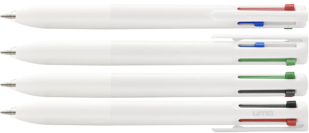 uma 4farb Kugelschreiber 4TunePen 0-4400 - Der uma Kugelschreiber 4TunePen ist ein Vierfarb-Kugelschreiber mit den Schreibfarben schwarz, rot, blau und grün. Der uma Kugelschreiber 4TunePen verfügt über eine Gummigriffzone. Das Gehäuse ist unifarben gedeckt mit farbigen Schiebedrückern in der entsprechenden Schreibfarbe. Ausgestattet ist der uma Vierfarb-Kugelschreiber 4TunePen mit der 8-0895 uma S1 Refill S1 Kunststoffmine mit silberner Schreibspitze und Wolfram-Karbid-Kugel. Schreibpaste nach ISO-Norm. Schreibleistung ca. 500 m. Strichstärke: 1.0mm. Schreibfarbe: blau, schwarz, rot, grün. Bedrucken Sie Ihren uma Vierfarb-Kugelschreiber 4TunePen auf dem Schaft.