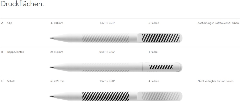 Bedrucken Sie Ihren prodir Kugelschreiber DS3 TFF auf bis zu 3 Druckflächen.