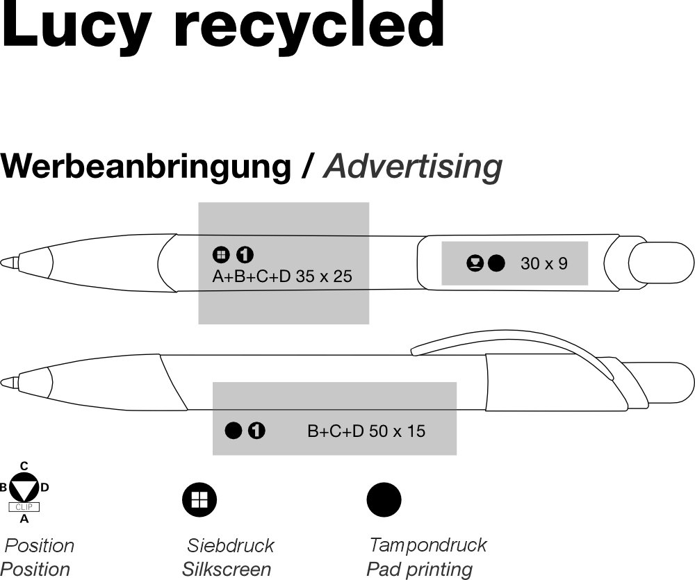 quatron Kugelschreiber Lucy recycled 42288 - Der quatron Kugelschreiber Lucy recycled ist ein hochwertiger Druckkugelschreiber „Made in Europe“ mit einer Griffzone für ermüdungsfreies Schreiben. Der Schaft, der geschwungener Clip und der Drücker des quatron Kugelschreibers Lucy recycled sind in Vollton Farben aus recyceltem Kunststoff (rABS). Der quatron Kugelschreiber Lucy recycled ist mit dem „Recycled“-Aufdruck gekennzeichnet. Ausgestattet ist der quatron Kugelschreiber Lucy recycled mit einer X20-Mine. Bedrucken Sie Ihren quatron Kugelschreiber Lucy recycled auf dem Clip und auf dem Schaft.