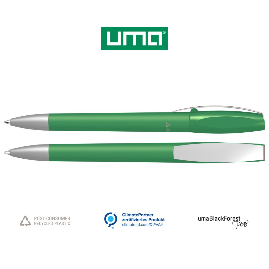 UMA Kugelschreiber CHILL C SI RECY 1-0043 - Der UMA Kugelschreiber CHILL C SI RECY ist ein Drehkugelschreiber mit gedeckt mattem Gehäuse aus 100% recyceltem Post-Consumer-Kunststoff. Der Metallclip und die schwere Metallspitze des UMA Kugelschreibers CHILL C SI RECY sind matt verchromt. Der UMA Kugelschreiber CHILL C SI RECY ist mit dem Recyclingzeichen gekennzeichnet. Dank der ClimatePartner-zertifizierten Produktion leistet der uma CHILL C SI RECY einen zusätzlichen nachhaltigen Beitrag zur Schonung der Umwelt. Aufgrund der Besonderheit des Materials (Post-Consumer Recycled Plastic) sind produktionstechnische Farbschwankungen gegeben. BlackForestPen – Designed in Deutschland, gefertigt in der Schweiz, zusammengefügt und veredelt im Schwarzwald. Ausgestattet ist der UMA Kugelschreiber CHILL C SI RECY mit einer 8-0855 uma Tech® Refill 1.0 black Europäische Kunststoff-Großraummine mit weißem oder schwarzem Kunststoffrohr, Neusilberspitze und Wolfram-Karbid-Kugel (1,0 mm). Die Schreibleistung des UMA Kugelschreibers CHILL C SI RECY beträgt ca. 4.500 m. Deutsche Schreibpaste nach ISO-Norm. Die uma Tech Refill 1.0 vermittelt ein angenehmes und weiches Schreibgefühl. Bedrucken Sie Ihren UMA Kugelschreiber CHILL C SI RECY auf dem Schaft und auf dem Clip. Der UMA Kugelschreiber CHILL C SI RECY eignet sich auch hervorragend für eine Lasergravur auf dem Clip.