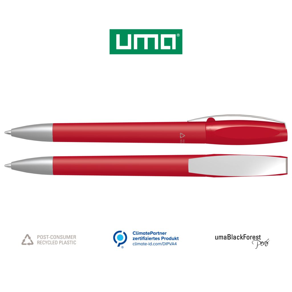 UMA Kugelschreiber CHILL C SI RECY 1-0043 - Der UMA Kugelschreiber CHILL C SI RECY ist ein Drehkugelschreiber mit gedeckt mattem Gehäuse aus 100% recyceltem Post-Consumer-Kunststoff. Der Metallclip und die schwere Metallspitze des UMA Kugelschreibers CHILL C SI RECY sind matt verchromt. Der UMA Kugelschreiber CHILL C SI RECY ist mit dem Recyclingzeichen gekennzeichnet. Dank der ClimatePartner-zertifizierten Produktion leistet der uma CHILL C SI RECY einen zusätzlichen nachhaltigen Beitrag zur Schonung der Umwelt. Aufgrund der Besonderheit des Materials (Post-Consumer Recycled Plastic) sind produktionstechnische Farbschwankungen gegeben. BlackForestPen – Designed in Deutschland, gefertigt in der Schweiz, zusammengefügt und veredelt im Schwarzwald. Ausgestattet ist der UMA Kugelschreiber CHILL C SI RECY mit einer 8-0855 uma Tech® Refill 1.0 black Europäische Kunststoff-Großraummine mit weißem oder schwarzem Kunststoffrohr, Neusilberspitze und Wolfram-Karbid-Kugel (1,0 mm). Die Schreibleistung des UMA Kugelschreibers CHILL C SI RECY beträgt ca. 4.500 m. Deutsche Schreibpaste nach ISO-Norm. Die uma Tech Refill 1.0 vermittelt ein angenehmes und weiches Schreibgefühl. Bedrucken Sie Ihren UMA Kugelschreiber CHILL C SI RECY auf dem Schaft und auf dem Clip. Der UMA Kugelschreiber CHILL C SI RECY eignet sich auch hervorragend für eine Lasergravur auf dem Clip.