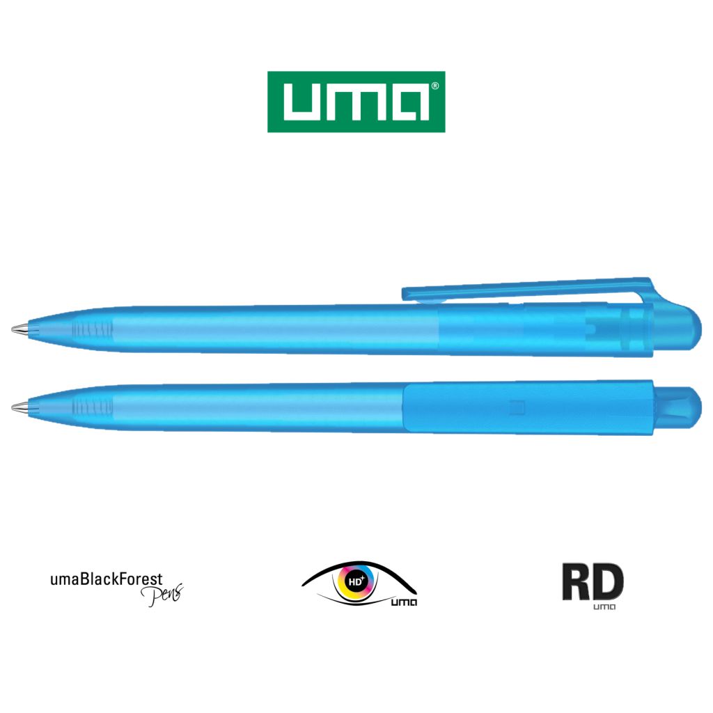uma Kugelschreiber JUMP frozen 1-0051 - Der uma Kugelschreiber JUMP frozen ist ein Druckkugelschreiber mit transparent gefrostetem Gehäuse und Clipdrücker. Ausgestattet ist der uma Kugelschreiber JUMP frozen mit einer 8-0855 uma Tech® Refill 1.0 blue Europäische Kunststoff-Großraummine mit weißem oder schwarzem Kunststoffrohr, Neusilberspitze und Wolfram-Karbid-Kugel (1,0 mm). Die Schreibleistung des uma Kugelschreiber JUMP frozen beträgt ca. 4.500 m. Deutsche Schreibpaste nach ISO-Norm. Die uma Tech Refill 1.0 vermittelt ein angenehmes und weiches Schreibgefühl. Bedrucken Sie Ihren uma Kugelschreiber JUMP frozen auf dem Schaft und auf dem Clip.UMA Schreibgeräte GmbH