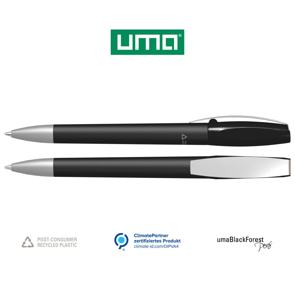 UMA Kugelschreiber CHILL C SI RECY 1-0043 - Der UMA Kugelschreiber CHILL C SI RECY ist ein Drehkugelschreiber mit gedeckt mattem Gehäuse aus 100% recyceltem Post-Consumer-Kunststoff. Der Metallclip und die schwere Metallspitze des UMA Kugelschreibers CHILL C SI RECY sind matt verchromt. Der UMA Kugelschreiber CHILL C SI RECY ist mit dem Recyclingzeichen gekennzeichnet. Dank der ClimatePartner-zertifizierten Produktion leistet der uma CHILL C SI RECY einen zusätzlichen nachhaltigen Beitrag zur Schonung der Umwelt. Aufgrund der Besonderheit des Materials (Post-Consumer Recycled Plastic) sind produktionstechnische Farbschwankungen gegeben. BlackForestPen – Designed in Deutschland, gefertigt in der Schweiz, zusammengefügt und veredelt im Schwarzwald. Ausgestattet ist der UMA Kugelschreiber CHILL C SI RECY mit einer 8-0855 uma Tech® Refill 1.0 black Europäische Kunststoff-Großraummine mit weißem oder schwarzem Kunststoffrohr, Neusilberspitze und Wolfram-Karbid-Kugel (1,0 mm). Die Schreibleistung des UMA Kugelschreibers CHILL C SI RECY beträgt ca. 4.500 m. Deutsche Schreibpaste nach ISO-Norm. Die uma Tech Refill 1.0 vermittelt ein angenehmes und weiches Schreibgefühl. Bedrucken Sie Ihren UMA Kugelschreiber CHILL C SI RECY auf dem Schaft und auf dem Clip. Der UMA Kugelschreiber CHILL C SI RECY eignet sich auch hervorragend für eine Lasergravur auf dem Clip.